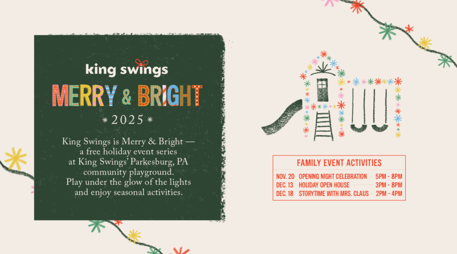 King Swings is Merry & Bright — a free holiday event series at our Parkesburg, PA community playground. Play under the glow of the lights and enjoy seasonal activities.