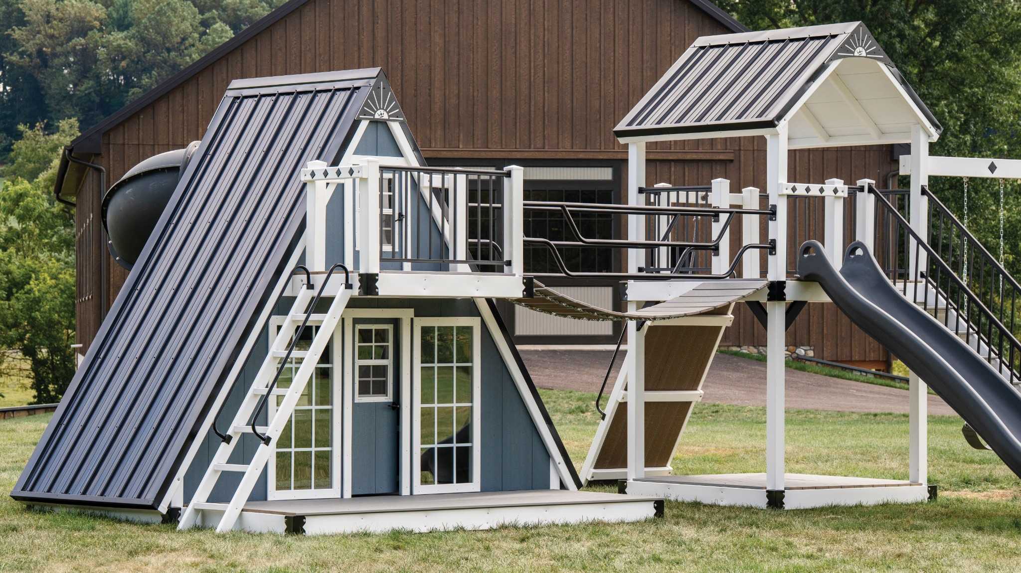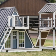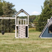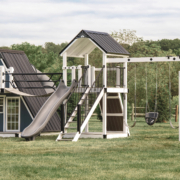 The Chalet A-frame Playset has the charm of the Summit A-frame Playhouse, but we didn’t stop there! With a bridge connecting the balcony of the playhouse to an additional tower, there is room for swings, climbers, and slides! It truly is the playhouse for families who want our new a-frame playhouses with an adventurous, modern look and all the fun of a playground.