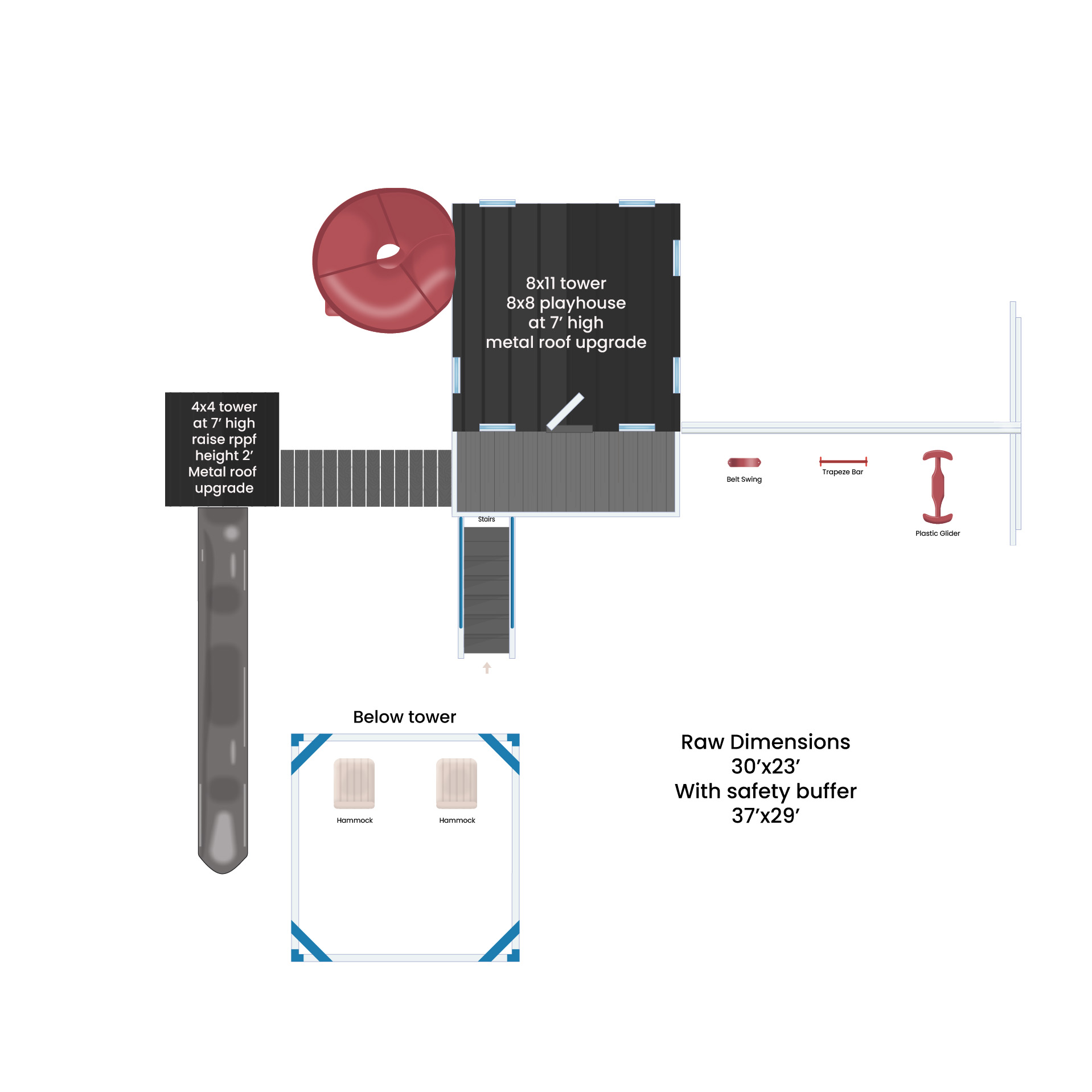 Towers: 8′ x 11′ Playdeck w/ 8′ x 8′ Playhouse, 4′ x 4′ Play Deck