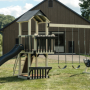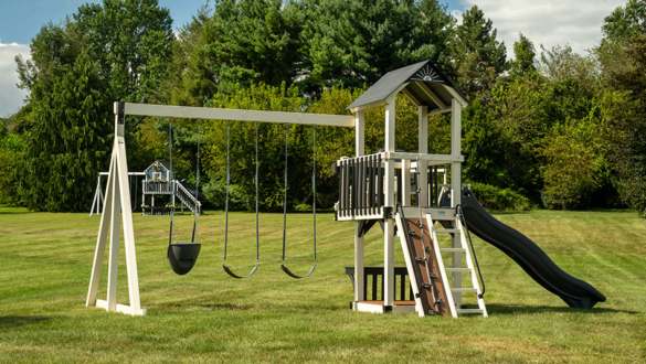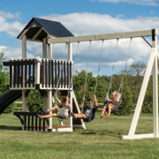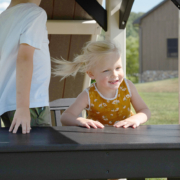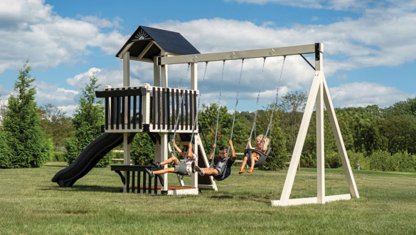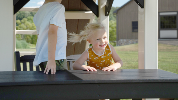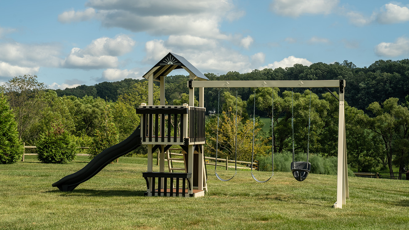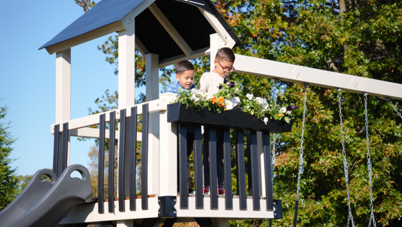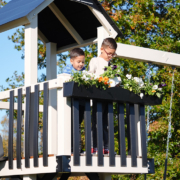 The Forest Loft vinyl swing set is a smaller footprint swing set designed for quieter moments, creative play, and classic backyard fun. At the heart of the Forest Loft backyard swing set is a playdeck with a balcony. It’s the perfect spot for kids to look out over the yard, play pretend, or curl up with a book. Getting to the top is part of the fun, with options to climb or step their way up before sliding back down.