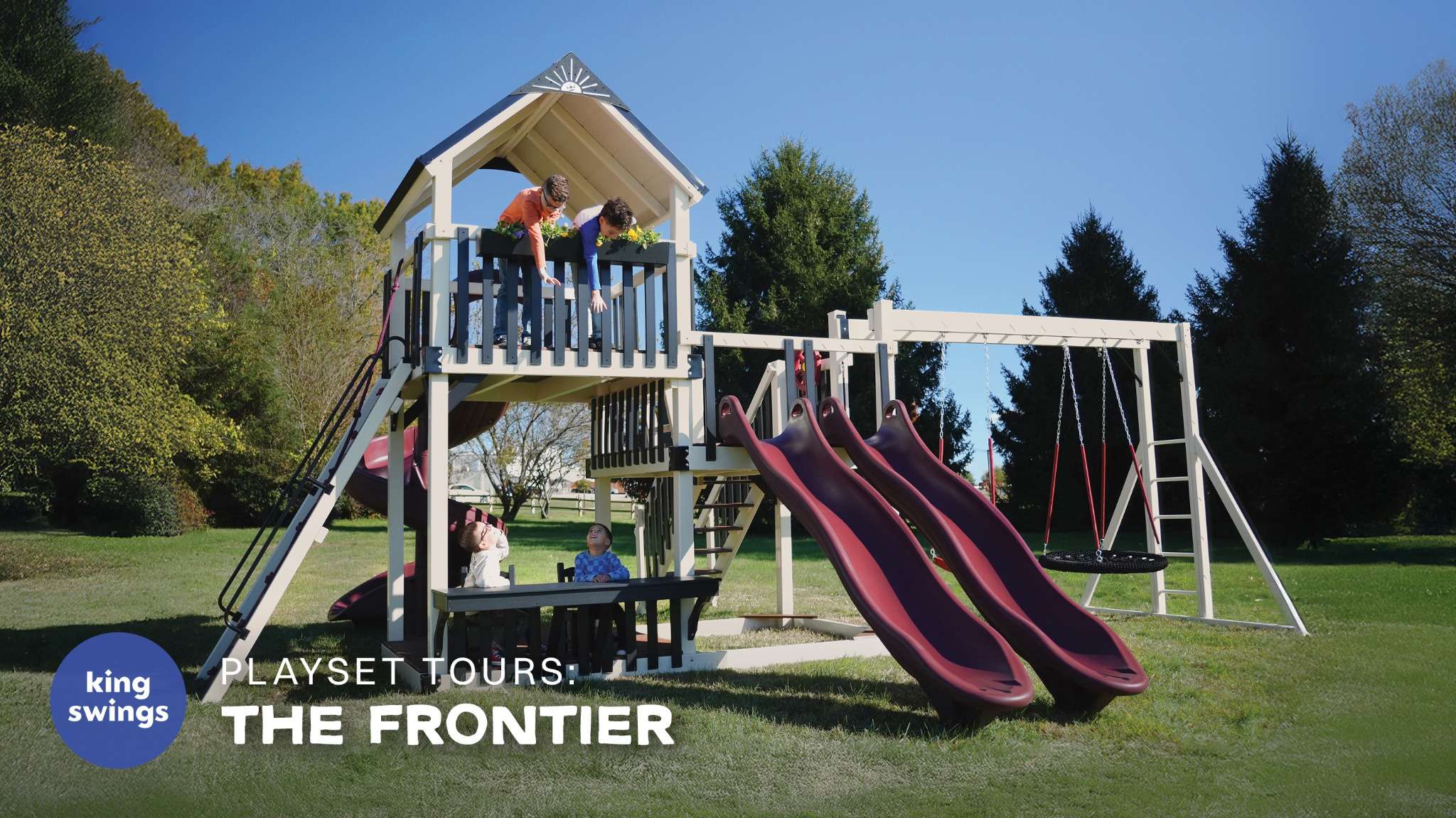 At the center of the Frontier is a multi-level play structure designed for exploration. Kids can climb the rock wall for a challenge or take the stairs. Once at the top of either playdeck, the fun takes off with dual racing slides for friendly competition and a twisting spiral slide that adds an extra thrill to every ride down.