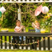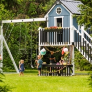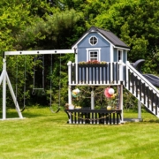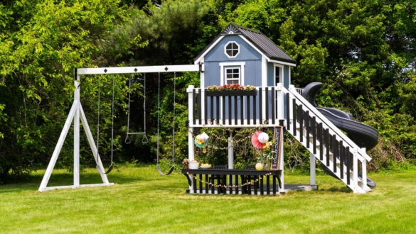 A super spiral slide provides plenty of fun, while the swing beam with three positions means there is room for everyone. Two floral window boxes adorn the railing, adding charming ‘curb’ appeal.