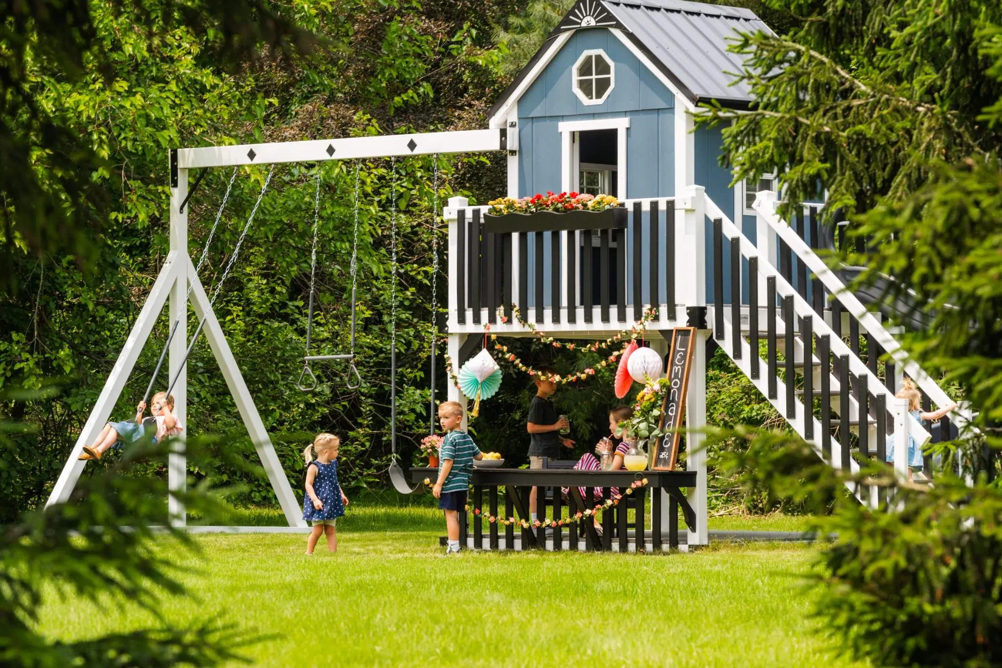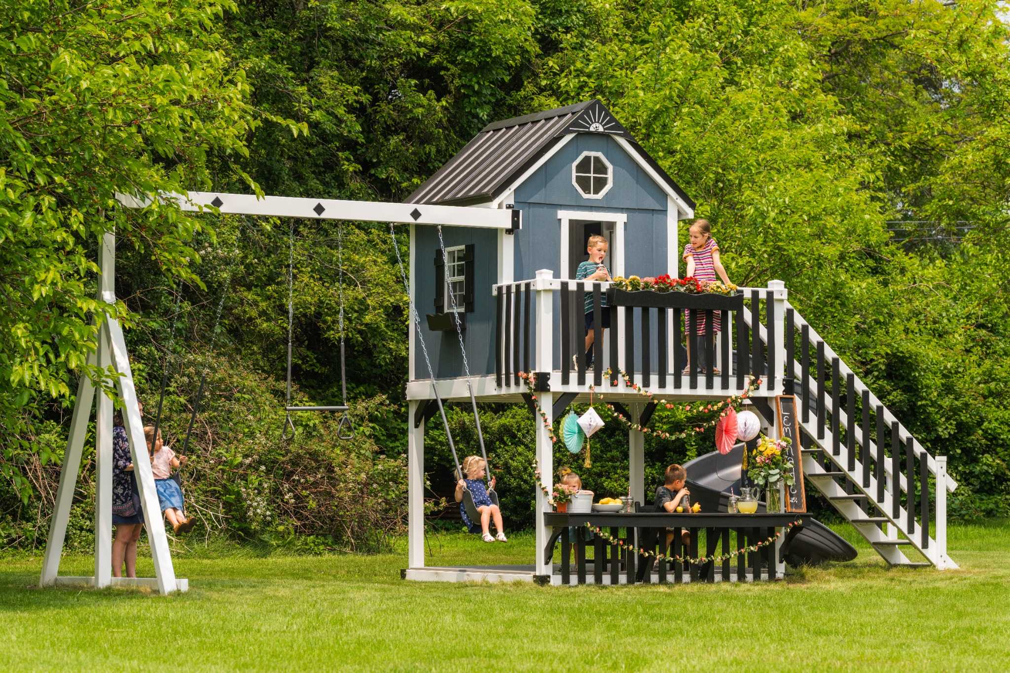 The Mansion is a charming playhouse swing set that will grow with your family. The spacious 6′ x 6′ playhouse and the 8′ x 8′ tower accommodate little ones and adults. The wrap-around porch has two doors, allowing for easy access to play and for airflow. The staircase with poly railings offers easy access to the playdeck. Decking and a lemonade stand under the tower create a spacious area to add outside toys or furniture.